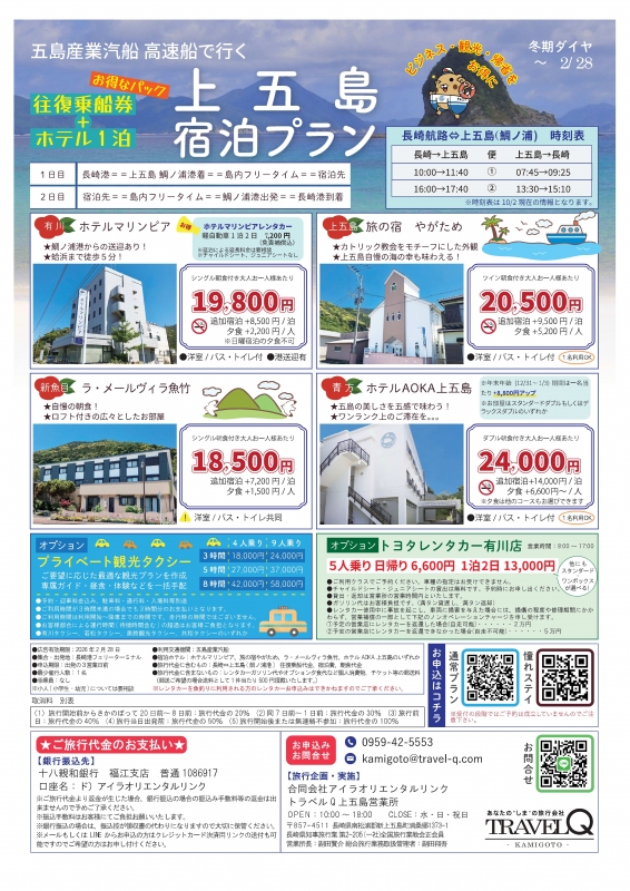五島産業汽船で行く 上五島宿泊プラン【通常プラン】【ハイクラスプラン】のご紹介
